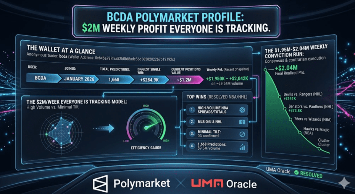 bcda Polymarket: $2M Weekly Profit. 1,668 Predictions. The Volume Machine Running Hot. TL;DR: @bcda joined Polymarket in January 2026 and…