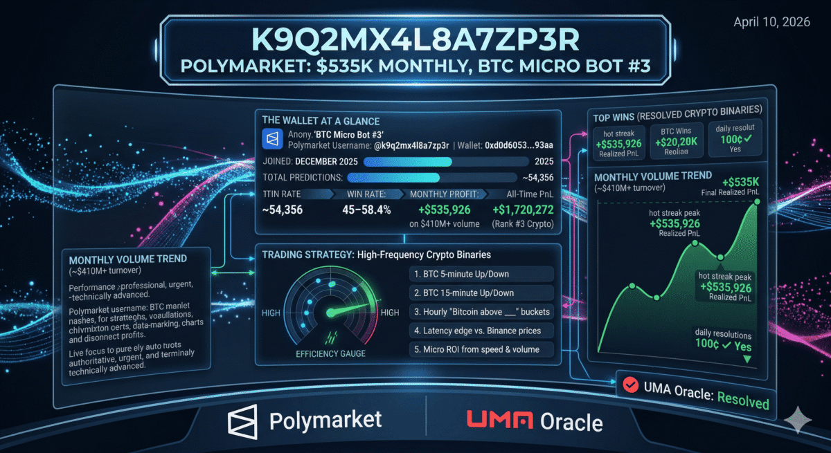 Who is k9Q2mX4L8A7ZP3R on Polymarket? k9Q2mX4L8A7ZP3R is a Polymarket crypto micro grinding bot at polymarket.com/@k9q2mx4l8a7zp3r with wallet address 0xd0d6053c3c37e727402d84c14069780d360993aa. The account joined in December 2025, has made 54,356 total predictions, and ranks #3 on Polymarket’s crypto monthly profit leaderboard with +$535,926 in April 2026 on over $410M in volume. The all-time PnL is approximately $1.43M to $1.72M.
