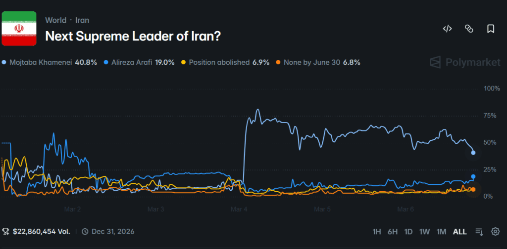 Caption: Polymarket Next Supreme Leader of Iran market odds as of March 6, 2026 Source: Polymarket.com