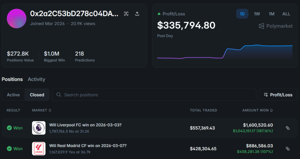 This is the same wallet that collected $943K betting against Liverpool at Wolverhampton just days earlier. At the time of the Celta trade, 0x2a2C had been active on Polymarket for roughly one week. In that single week, the wallet had already generated more profit than most prediction market traders see in a year.