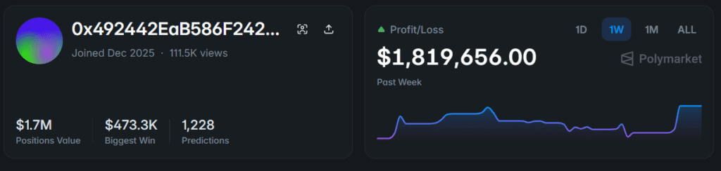 - The full wallet address is public and trackable right now. Unlike the 0xbddf61af bot that stays deliberately obscured, 0x492442 is fully confirmed across multiple tracker feeds. Paste it into fireplace.gg, oneowl.app, or Polymarket’s explorer to see current positions immediately.