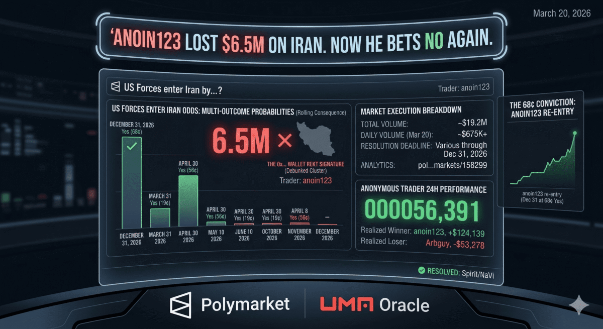 This is the same wallet that lost approximately $6.5M betting the US would not strike Iran ahead of the February 28 strikes. That position — built on No shares across multiple “US strikes Iran by” date buckets — collapsed to zero when strikes were confirmed. The anoin123 blowup became one of the most discussed single-day losses in Polymarket history, covered across on-chain alert feeds and crypto media.