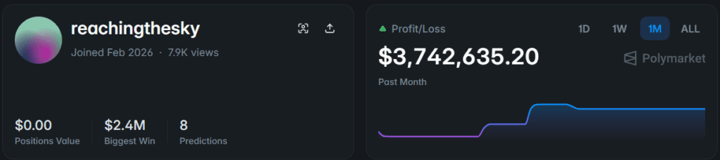 TL;DR: reachingthesky Polymarket is the most talked-about new wallet of March 2026. The account joined in February, started with approximately $25K to $26K, and turned it into $3,742,635 in realized profit across five to seven trading days between March 14 and 19. A single PSG vs Chelsea UCL bet generated $3.2M of that total. A Rayo Vallecano La Liga position added another $2M. Along the way, three positions went to complete zero for a combined $1.47M in losses. Win rate: 33%. All-time ROI: 27.2%. Here is every confirmed bet, every loss, and the full wallet breakdown.